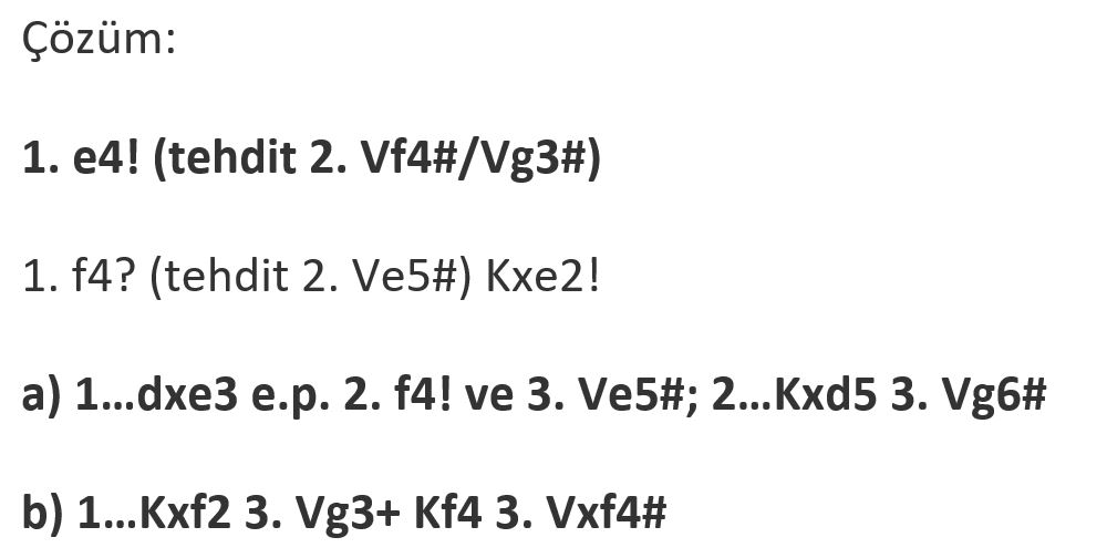 a) 1…Kd4 2. c4 (tehdit 3. Ve3#) bxc3 e.p. 3. Vb7#; 2…Kd3 3. Vxd3#; (ana varyant)