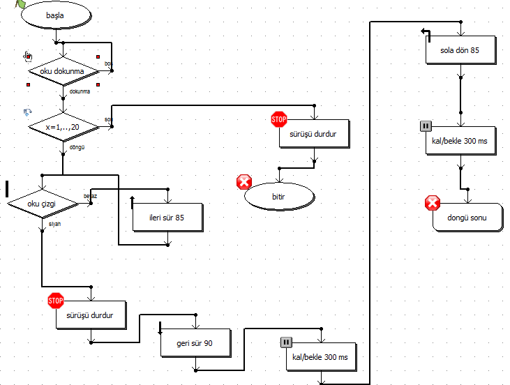 Yaptığımız akış şemasına göre robotumuz dokunma algılayıcıya dokunduğumuzda 85 süratle ileri sürmeye başlıyor. Robotumuzun sayı sayabilmesi için öncelikle for döngüsü oluşturduk. For döngüsünde robotumuz çizgi sayacak. 20 tane çizgi ile karşılaştıktan sonra robot sürüşü durduracak. Robotumuz her çizgi ile karşılaştığında önce 300 ms 90 süratle geri sürecek, sonra 300 ms 85 süratle sola dönecektir. Döngü oluşturduğumuz için robot toplamda 20 çizgiyi tamamlayana kadar aynı işlemleri yapmaya devam edecek. For döngüsünde saydırdığımız çizgi sayısını artırıp azaltarak robotun parkur üzerindeki hareket süresini değiştirebiliriz.