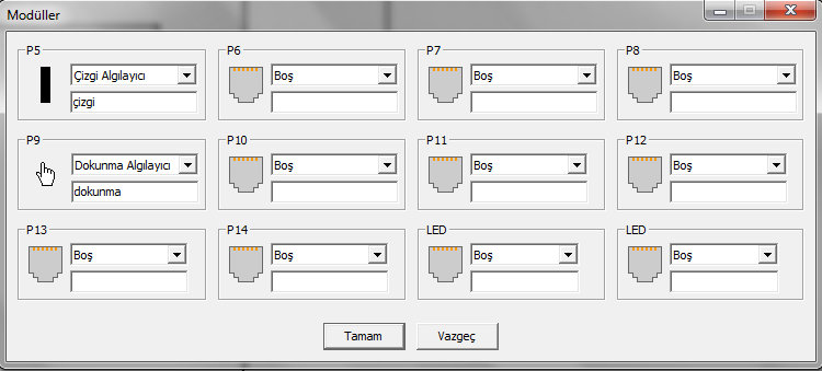 O-bot’a eklediğimiz çizgi algılayıcının ve dokunma algılayıcının çalışabilmesi için öncelikle modüller kısmında tanımlamamız geliyor.